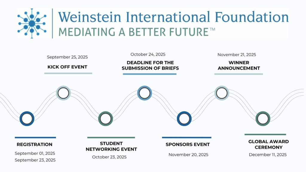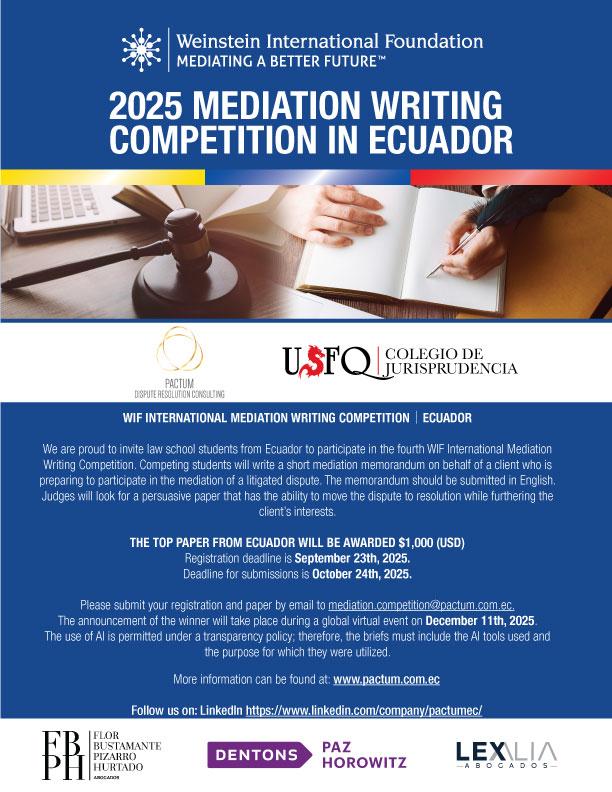 La Fundación Internacional Weinstein lo invita a participar en el Concurso Internacional de Redacción sobre Mediación de este año en Ecuador. Los estudiantes de pregrado de facultades de derecho acreditadas en Ecuador son elegibles para participar en la competencia. La competencia tiene como objetivo aumentar el interés de los estudiantes en la mediación y mejorar el nivel de habilidad de la defensa de la mediación.